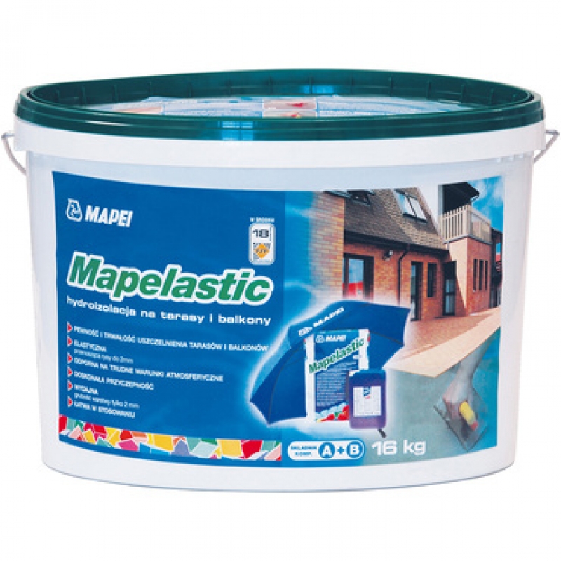 Mapelastic je dvousložková velmi pružná cementová hydroizolační stěrka, která se používá k vodotěsné ochraně betonu, bazénů a balkónů. Spotřeba cca. 1,7 kg/m2 a mm tloušťky při nanášení ocelovým hladítkem 2,2 kg/m2 a mm tloušťky při nanášení nástřikem.